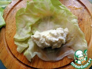 Срезать с листьев толстые прожилки. Положить по 1 ст. л. начинки и завернуть голубцы.