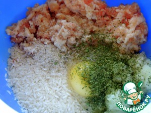 К фаршу добавить перекрученный лук и чеснок, рис белый длиннозерный «Индика» от Мистраль, яйцо, соль, перец и петрушку. Всё перемешиваем.