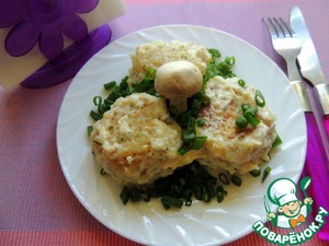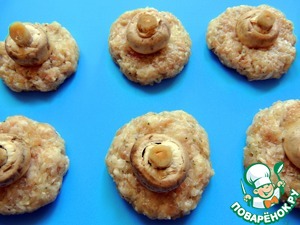 Из фарша делаем лепёшки, по центру кладём гриб.