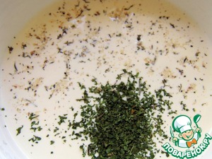 Для соуса соединяем сливки и молоко, добавляем муку, петрушку, солим и перчим. Всё хорошенько перемешиваем.
