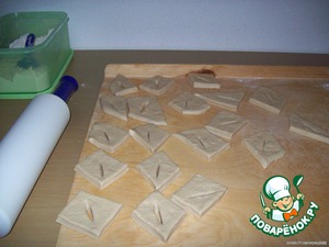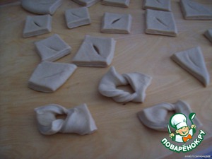 Тесто раскатать в пласт толщиной с палец и нарезать произвольными квадратиками или ромбами, в середине каждого прорезать отверстие.