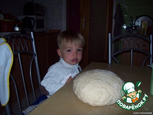 Творог выложить в чашку, всыпать разрыхлитель и перемешать. Затем вбить яйца - перемешать, добавить соль, сахар, если хотите кребли послаще, то добавьте побольше, я много не кладу - не люблю сильно сладкие. Затем влить стакан воды и стакан растительного масла, всё перемешать и, добавляя муку, вымесить эластичное тесто, оно не должно быть крутым, но такое, чтобы раскатывать скалкой. Тесто положить "отдыхать". Пока моё тесто отдыхало, я работала на даче. Мне сегодня помогал делать тесто мой внук.