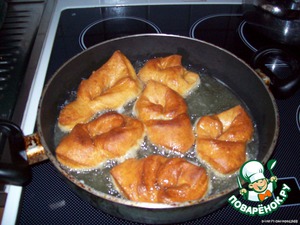 В глубокую сковороду налить растительное масло, желательно побольше, чтобы кребли плавали и перед тем как положить кребли в сковороду, я их завязываю, так сказать, узлом, вот так.