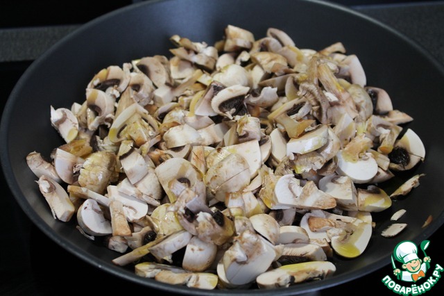 Картофель моем, отвариваем в мундире и оставляем остывать. Моем грибы, произвольно нарезаем и обжариваем с небольшим количеством растительного масла на сильном огне. Чтобы грибы жарились, а не тушились, они должны немного обсохнуть после мытья и жарить их надо на сильном огне, тогда вода не будет выделяться. Оставляем остывать.