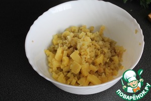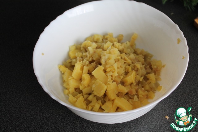 Остывший картофель очищаем от шкурки, нарезаем мелкими кубиками.