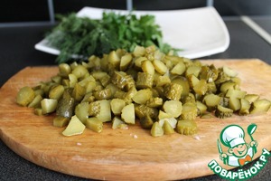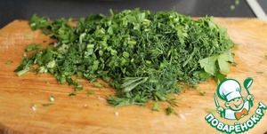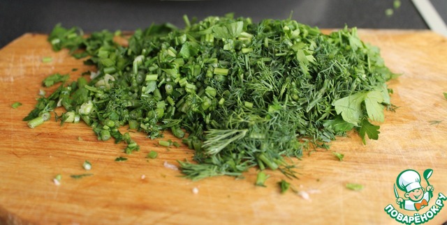 Зелень мелко шинкуем. Из обязательной зелени в этом салате только укроп, остальное по желанию. Я взяла небольшой пучок укропа и петрушки.