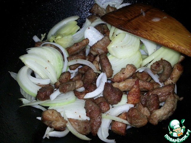 Добавить лук и обжарить вместе с мясом на большом нагреве до прозрачности