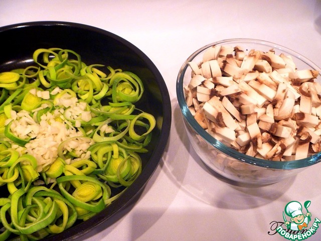 В небольшом количестве растительного масла потушите до полупрозрачности нарезанный лук порей и чеснок.