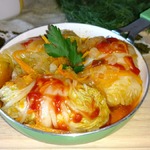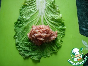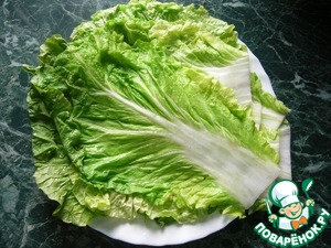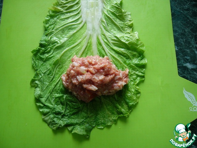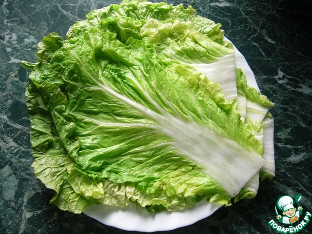 Пока варится рис-подготовить листья. Капусту промыть, разобрать на листья, поставить на 2 минуты в микроволновку при мощности 750 Вт. После чего срезать лишние утолщения и мелко их нарезать.