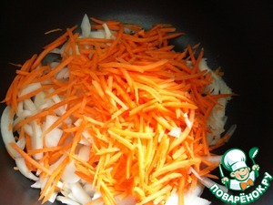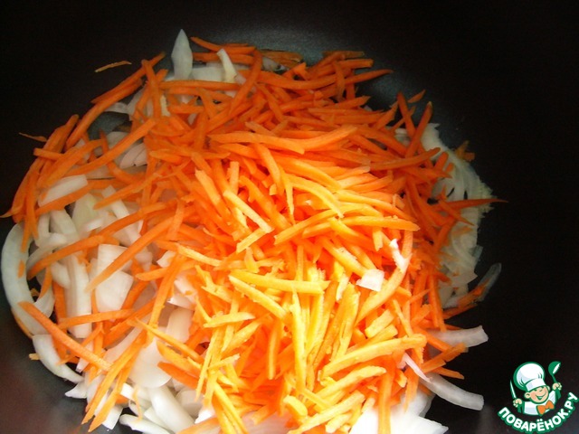 Лук нарезать полукольцами, морковь соломкой (я тёрла на тёрке для корейской моркови). Обжарить на растительном масле на программе"Жарка" 2-3 минуты. Мультиварку выключить.
