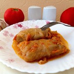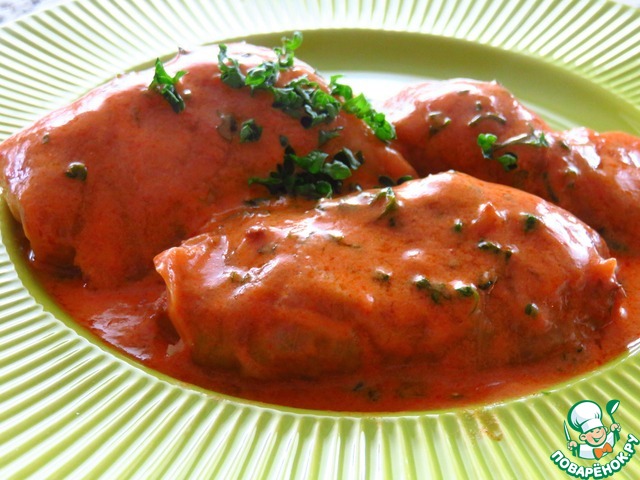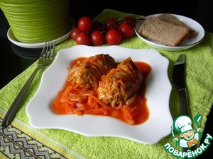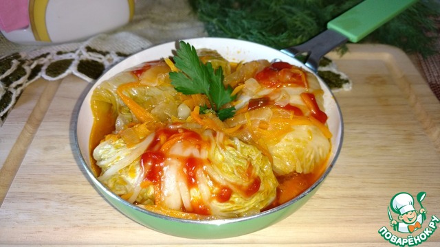 Голубцы из пекинской капусты на овощной подушке из моркови и лука, тушёные в томатном соке в мультиварке.