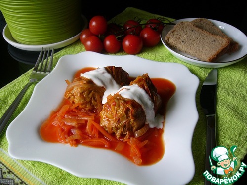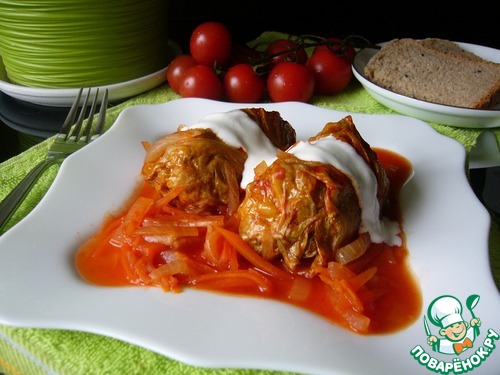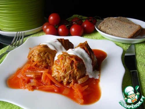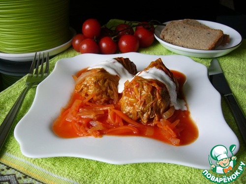 Готовые голубцы выложить на тарелку вместе с овощами. При желании подать сметану
