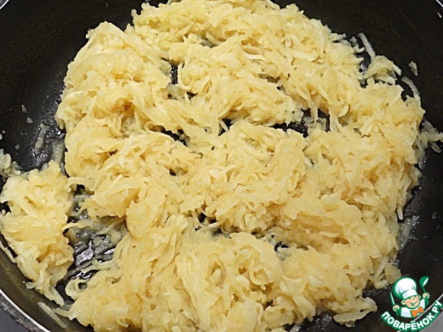 Сначала готовлю яблочный слой. Яблоки мою, очищаю от кожуры, натираю на крупной терке. На сковороде на сливочном масле немного тушу натертые яблоки с сахаром и лимонным соком до испарения лишней влаги.