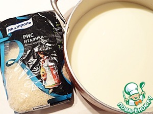 Готовлю рисовый слой. В кастрюлю наливаю молоко, добавляю рис, сахар, соль и готовлю кашу.