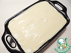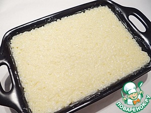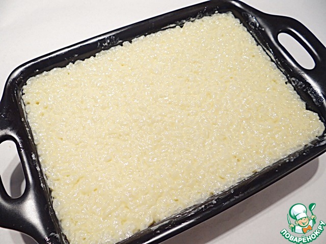 Форму (размер моей формы 16*23 см) смазываю сливочным маслом. Выкладываю половину рисового слоя, выравниваю поверхность. Затем выкладываю яблочный слой, снова выравниваю поверхность.