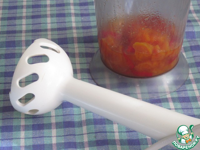Немного остудим и измельчим составляющие соуса блендерем. Если как Вам, кажется соус густоват, добавим немного кипяченой воды.