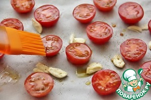 Помидоры-черри разрезать на половинки, чеснок - пластинками. Уложить все, на покрытый бумагой для выпечки, противень. Смазать оливковым маслом, поперчить, слегка посолить и запечь в духовке при температуре 180° в течении 20 мин.