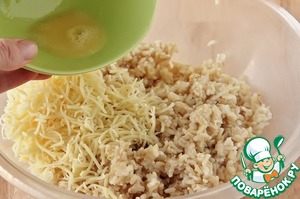 Когда рис остынет, смешать его с твердым сыром (в идеале с сыром чедар, но подойдет любой) и одним, немного взбитым, яйцом.