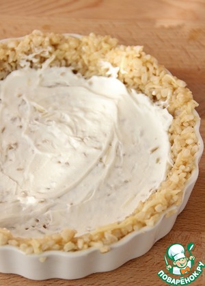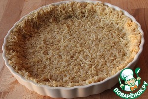Форму смазать маслом и распределить рисовую массу, утрамбовыя дно и бока. Поставить в разогретую до 200° духовку и выпекать в течении 15 мин.
