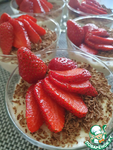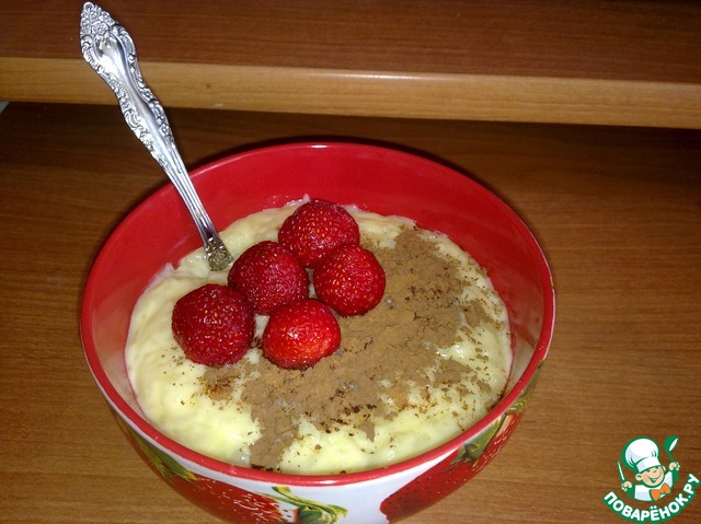Поместить кашу в креманки и желательно охладить еще и в холодильнике. Посыпать корицей или шоколадом и украсить клубникой. Угощайтесь!