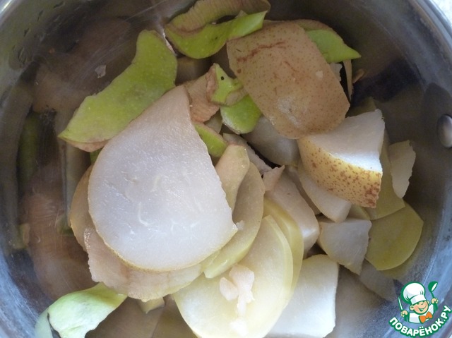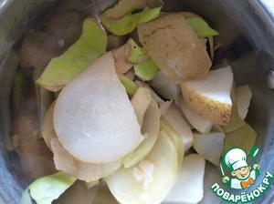 Берём наши фрукты. У меня были свежие яблоки, груши, чуточку чернослива. Туда же пошла лимонная шкурка и шкурка от очищенного яблока. Последняя не из компота, просто ребёнок у меня свежие яблочки кушает :) Вообще подойдут любые варёные и не варёные фрукты\сухофрукты\яг оды.