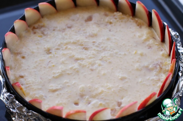 За бортами из фольги, выкладываем дольки яблок по кругу. Как на фото.