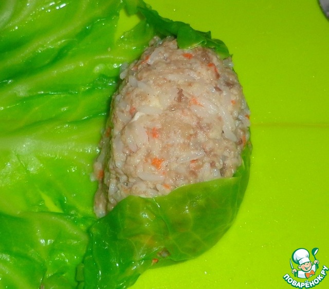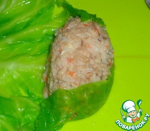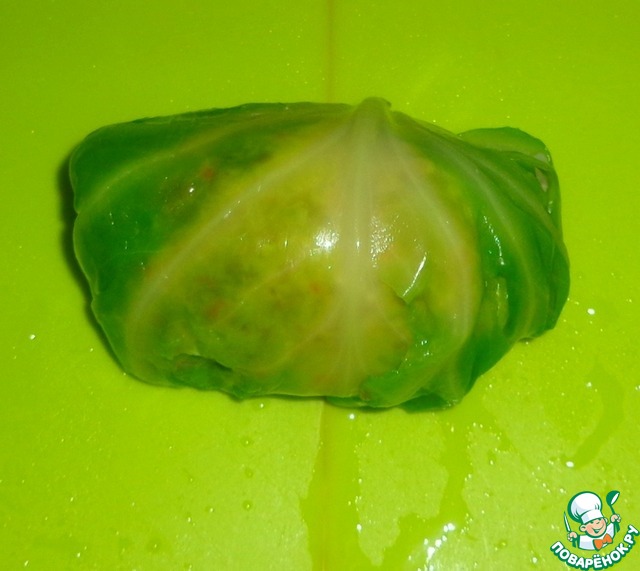 Заворачиваем аккуратно в капустный лист. Хочу отметить, что капустные листья должны быть большими, чтобы можно было завернуть в них фарш с яйцом.
