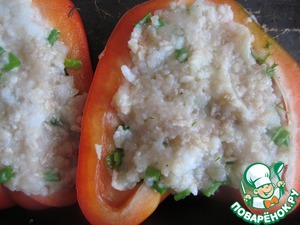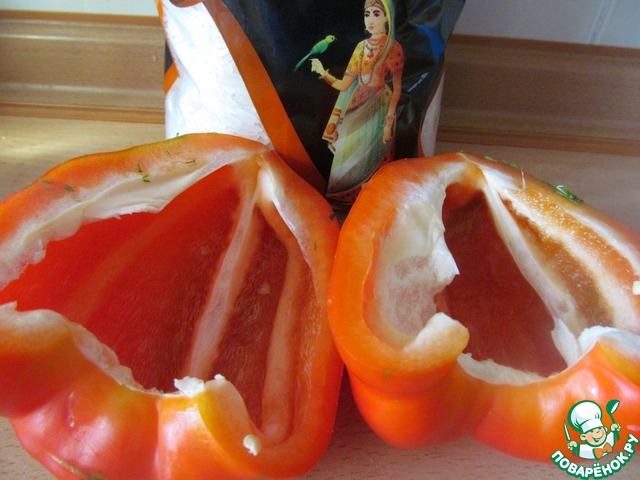 2. Подготовить перец. Я брала крупный красный перец, разрезать его на 2 половинки