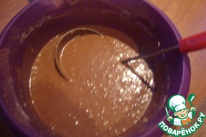 Взбить яйца с сахаром, добавить какао, растопленное масло или маргарин, тёплое молоко, гашенную соду и муку. Всё хорошо перемешать - получается тесто не густое, льющееся.