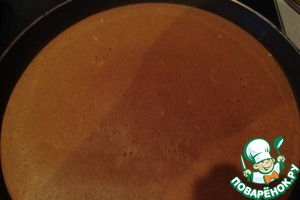 Берём антипригарную сковороду, разогреваем её - наливаем один черпак теста, аккуратно распределяем по сковороде, на маленьком огне, закрываем крышкой (у меня стеклянная) и жарим корж около 1 минуты, как толстый блин)