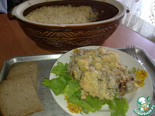 Сегодня я к вам с простым в приготовлении рецептом из старой записной книги. Запеканка с сочной начинкой, под золотистой, рассыпчатой сырной крошкой.