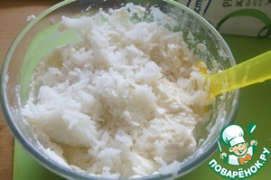 Затем вскрываем пакетик с готовым рисом и высыпаем рис к творогу. Перемешиваем.
