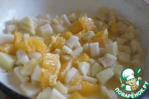 Пока запеканка готовится, приготовим карамелизованные фрукты. Для этого фрукты очищаем от кожицы. Грушу режем произвольными небольшими кусочками. У апельсина отделяем мякоть.