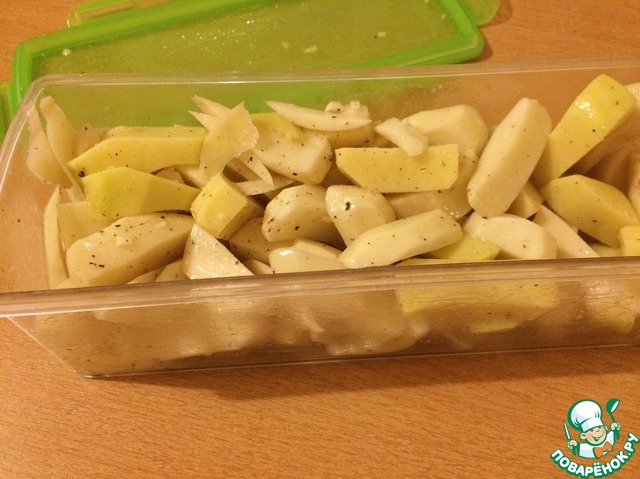 все это хорошенько перемешиваем, так сказать маринуем картофель. Оставляем его минут на 5 - 10.