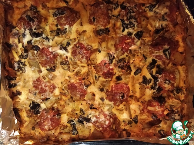 Устилаем противень фольгой. и выкладываем на него картофель, полуготовые фрикадельки и заливаем равномерно томатным соусом, в котором они готовились.