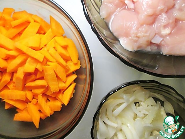 Морковь нарежьте ломтиками наискосок, затем брусочками среднего размера. Лук нарежьте полукольцами, филе кусочками со сторонами примерно 2-3 см.