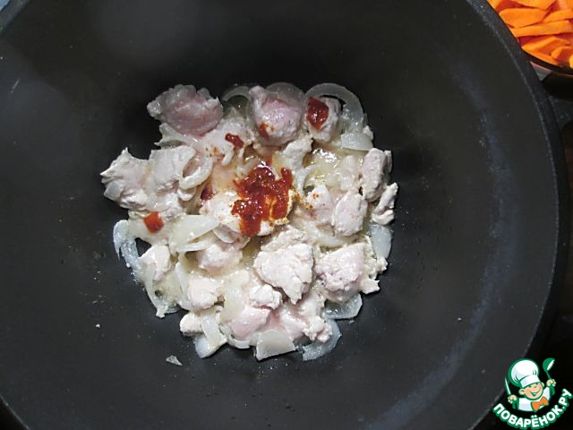 Разогрейте в казане или в глубокой сковороде растительное масло, добавьте лук и филе, обжарьте, не закрывая крышкой, около 10 минут, помешивая время от времени. Мясо должно почти полностью побелеть, добавьте томатный соус и перемешайте.