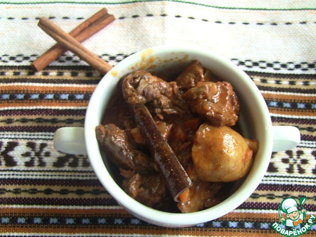 И финальный аккорд: доливаем немного горячей воды или бульона, чтобы мясо было покрыто полностью. Но не переборщите с водой, мясо должно быть лишь слегка покрыто! Добавим лавровый листик и палочку корицы. Внимание! Главный всплеск вкуса обеспечит именно корица: аромат просто непревзойденный!!!