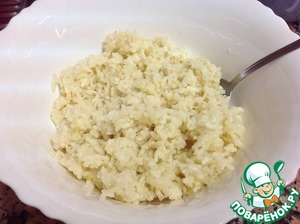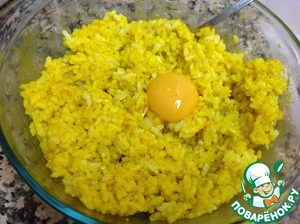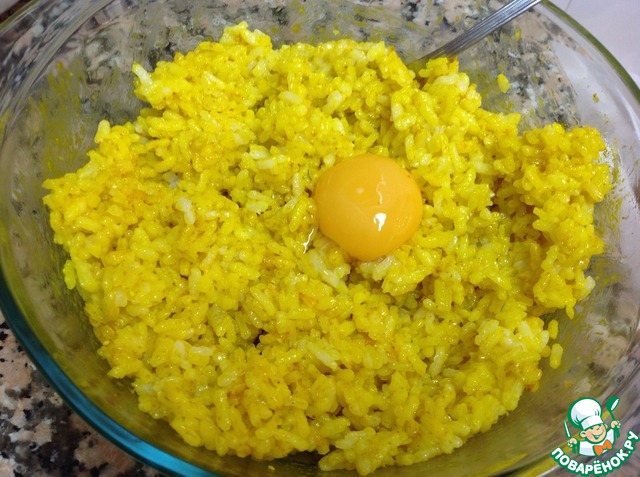 Запеканку сделаем разноцветной, для этого нам понадобится одну часть риса смешать с карри и желтком