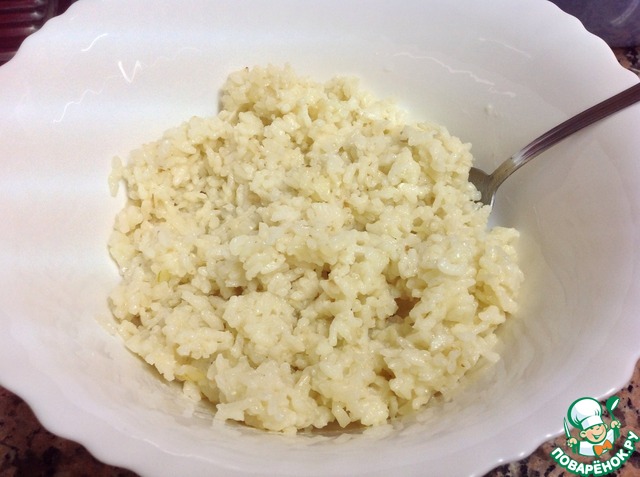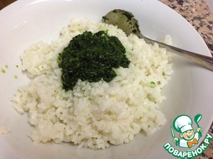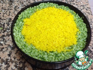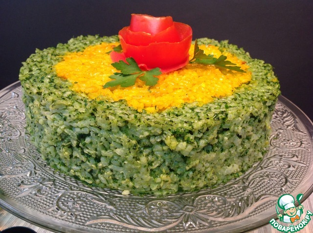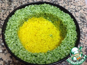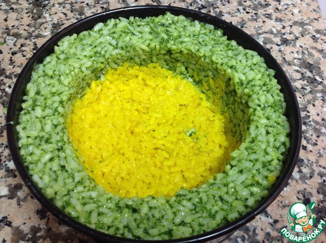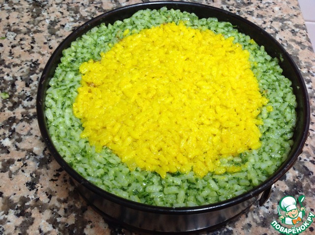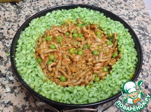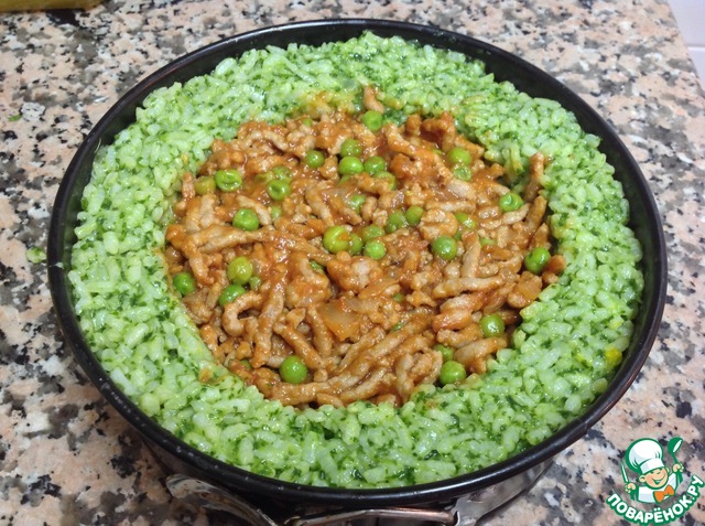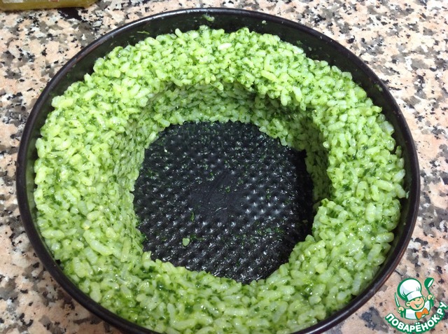 Когда все составляющие нашей запеканки готовы, приступим к оформлению. Зеленый рис выложить в форму и сформировать бортики