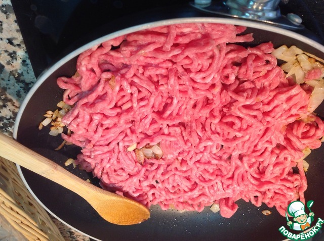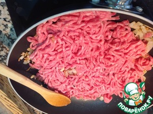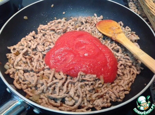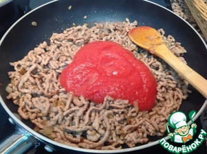 Когда фарш прожарится, залить пассерованным томатом. Тушить 10 минут