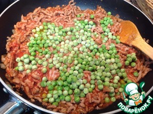 Затем высыпать зеленый горошек ( у меня замороженный) соль, перец по-вкусу. Довести до готовности.