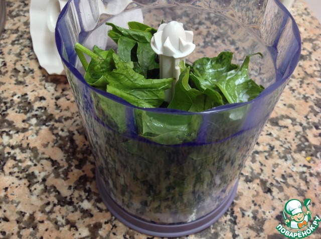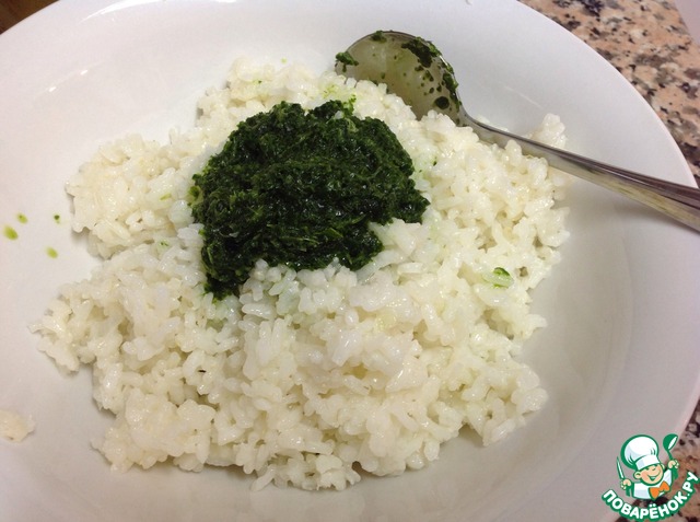 А другую для зеленого риса, протрем на блендере вымытый шпинат с 1/2 стакана молока и немного оливкового масла