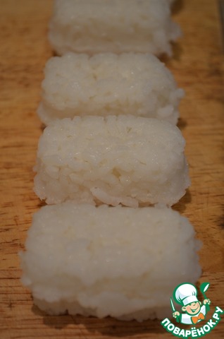 Мокрыми руками или с помощью специальных формочек сделать из риса небольшие прямоугольные котлетки.