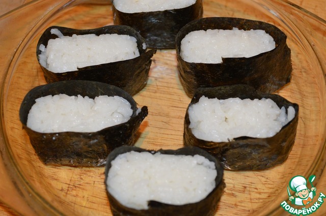 Обернуть их полосками из нори и закрепить рисинками.