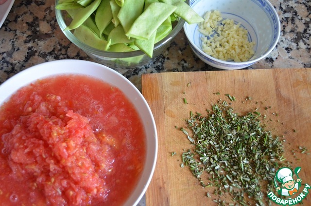 1. Помидор натереть на крупной терке так, чтобы у вас получилось томатное пюре, а в руке осталась кожица. Она нам не пригодится. Зеленую фасоль порезать на длинные брусочки. Чеснок и розмарин мелко порубить.