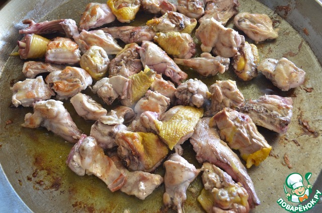 2. Кусочки курицы и кролика обжарить в оливковом масле до золотистого цвета (5-7 минут), посолить и поперчить.