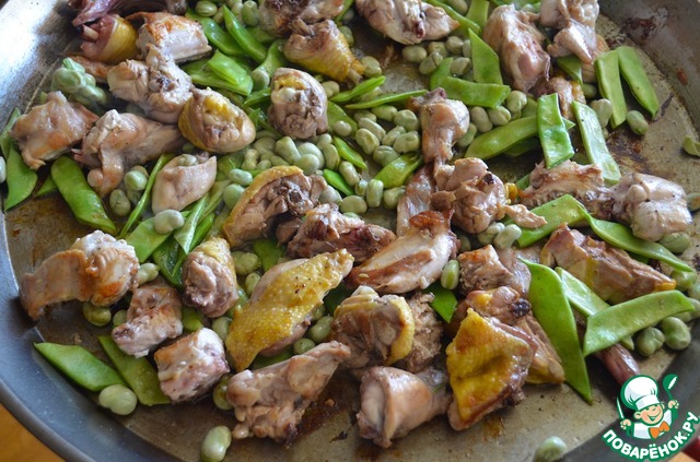 3. Добавить зеленую и белую фасоль и бобы, размешать и готовить 2 минуты.