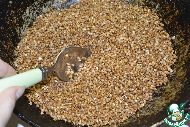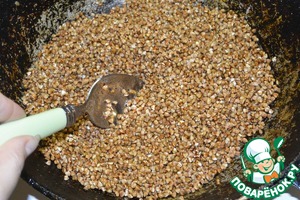 Обжарить крупу на раскаленном масле в течении 5 минут, постоянно мешая. Гречка благодаря обжарки становится блестящей и рассыпчатой.