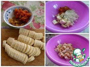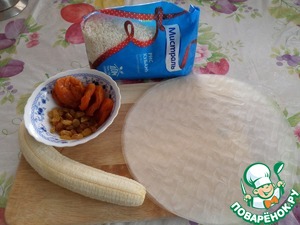 Промываем курагу и изюм, очищаем банан. Нарезаем банан - полукольцами, курагу - кубиками. Добавляем отварной рис и перемешиваем. Начинка готова.